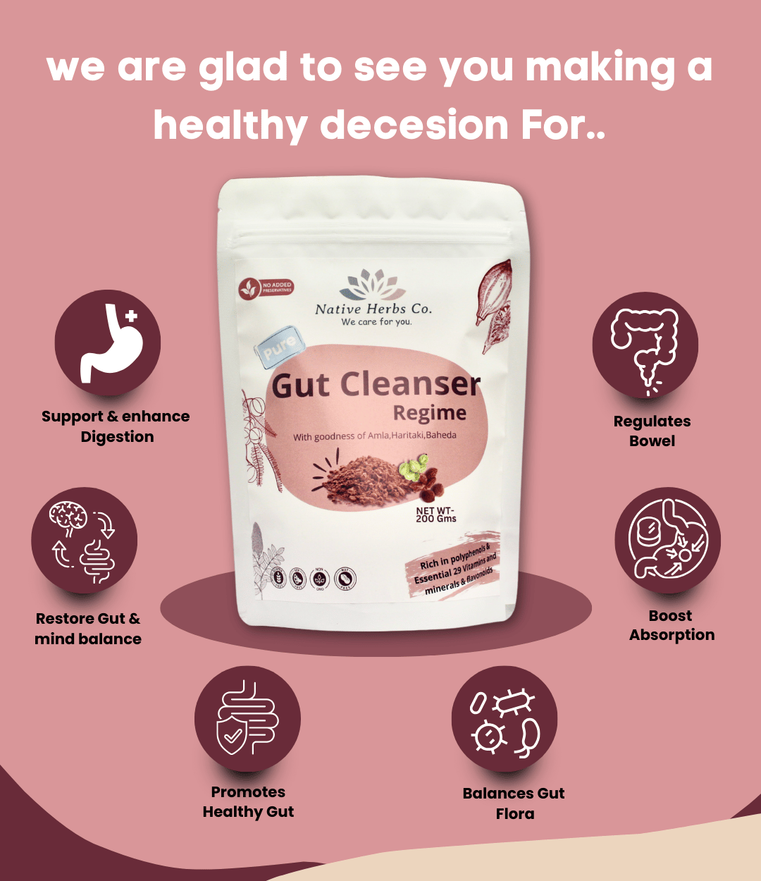 Reset your digestive health with Gut Cleanse+, a powerful blend crafted with the ancient wisdom of Triphala Churna. This proprietary formula by Native Herbs gently detoxifies, improves gut health, and supports a balanced digestive system. Rich in antioxidants and natural fiber, Gut Cleanse+ helps you feel lighter, cleaner, and more energized every day.