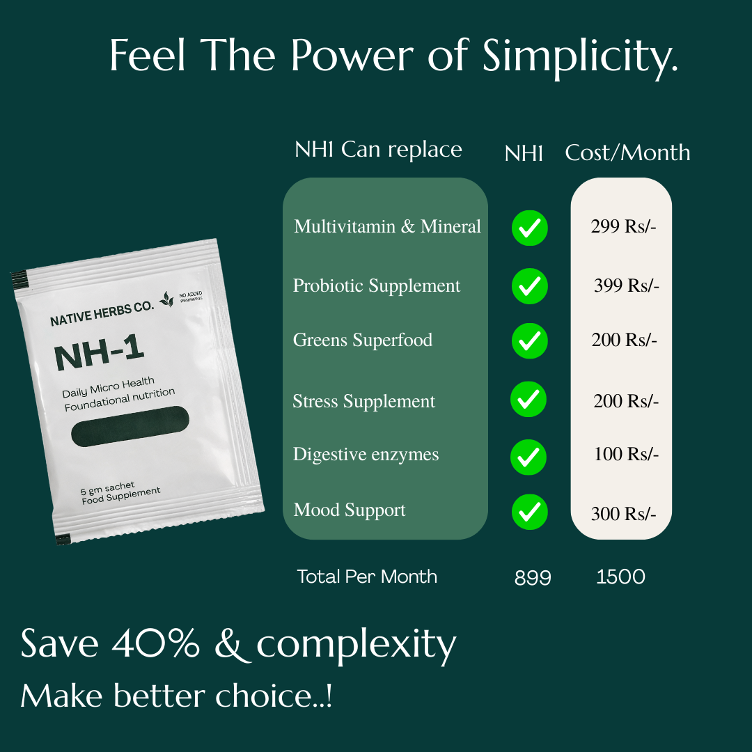NH-1 changes the game. With a complete 5 gms of sachet & science-backed blend, to accomodate meaningfull doses of all multivitamins, minerals, probiotics, prebiotics, digestive enzymes, superfoods, and antioxidants, it not only delivers the right nutrition — it also ensures better absorption, easier digestion, and lasting energy.